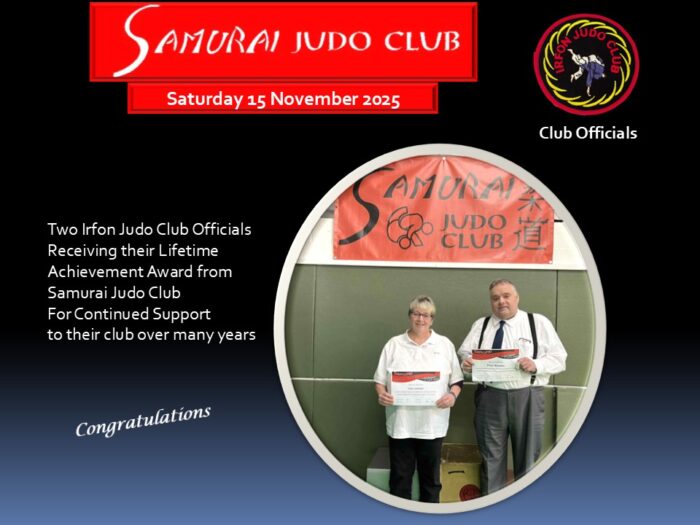 Congratulations to Lisa and Peter in being awarded a Lifetime Achievement Award from Samurai Judo Club for all your hard work and comittment given to Samurai Judo Club for officiating at Competitions.